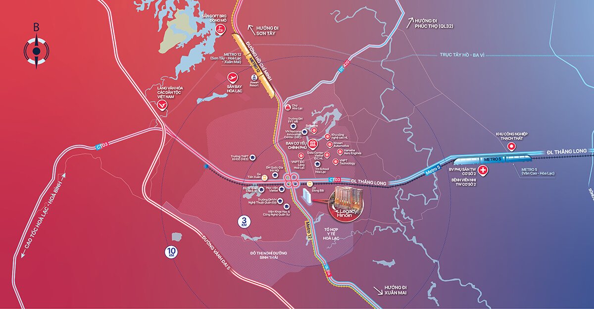 Legacy Hinoiri tọa lạc tại lô CT-01, xã Hòa Lạc, huyện Thạch Thất, Hà Nội – ngay trong khu đô thị vệ tinh phía Tây Thủ đô, nơi hội tụ nhiều trường đại học, viện nghiên cứu, trung tâm công nghệ và hạ tầng hiện đại. Đây là khu vực được định hướng trở thành thành phố khoa học – công nghệ trong tương lai.